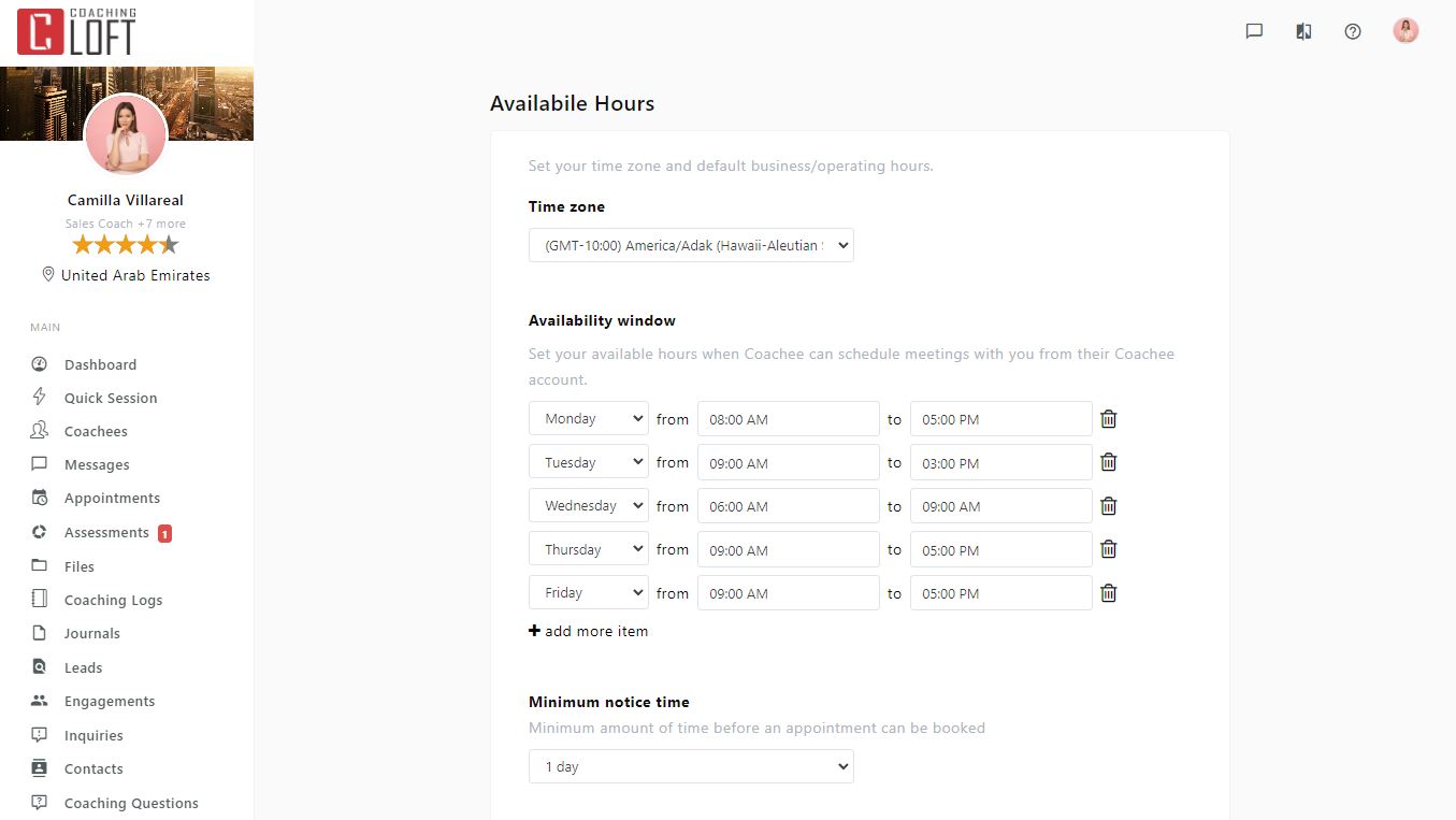 - Define the days and time ranges when you are available for coaching sessions.