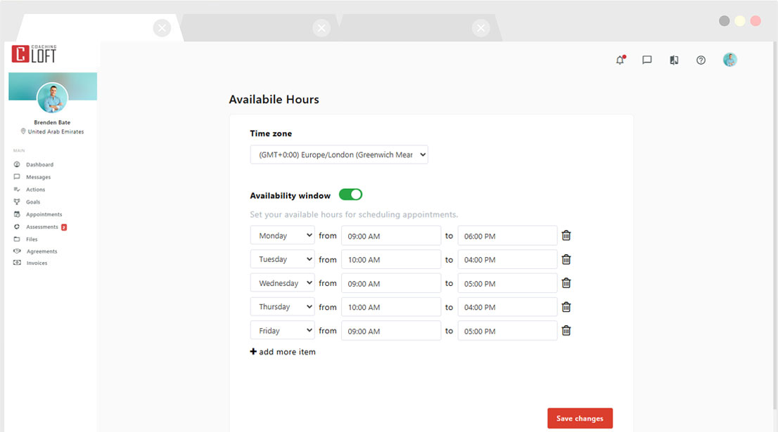 - Define the days and times when you are available for your coach to schedule sessions with you.