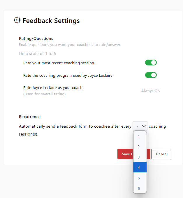 Define how frequently you want the feedback form to be sent (e.g., after every session, every 3rd session, etc.).
