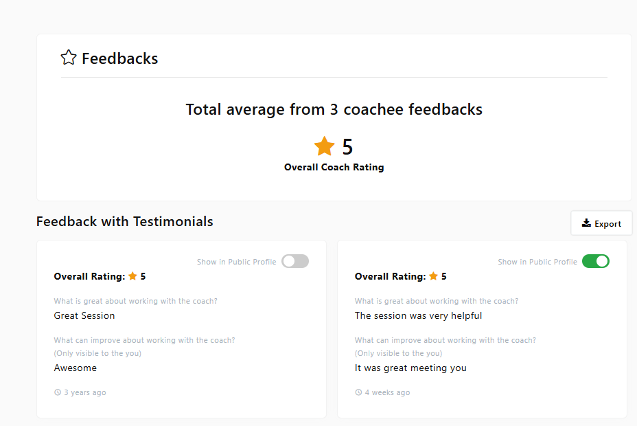 This is a valuable feature if you'd like to build credibility and social proof through coachee testimonials.