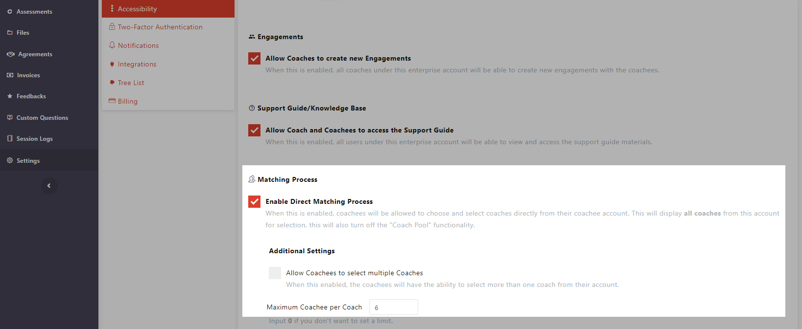 When this is enabled, you allow coachees to select multiple coaches from their account. - Maximum Coachee per Coach