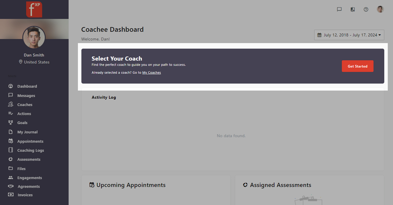 Upon clicking the "Get Started" button, users will be directed to the Coach Selector Interface. Here, they can search for a coach that suits their preferences using the built-in filters.