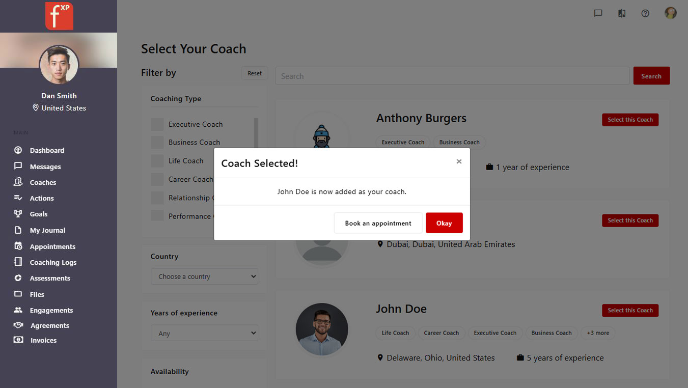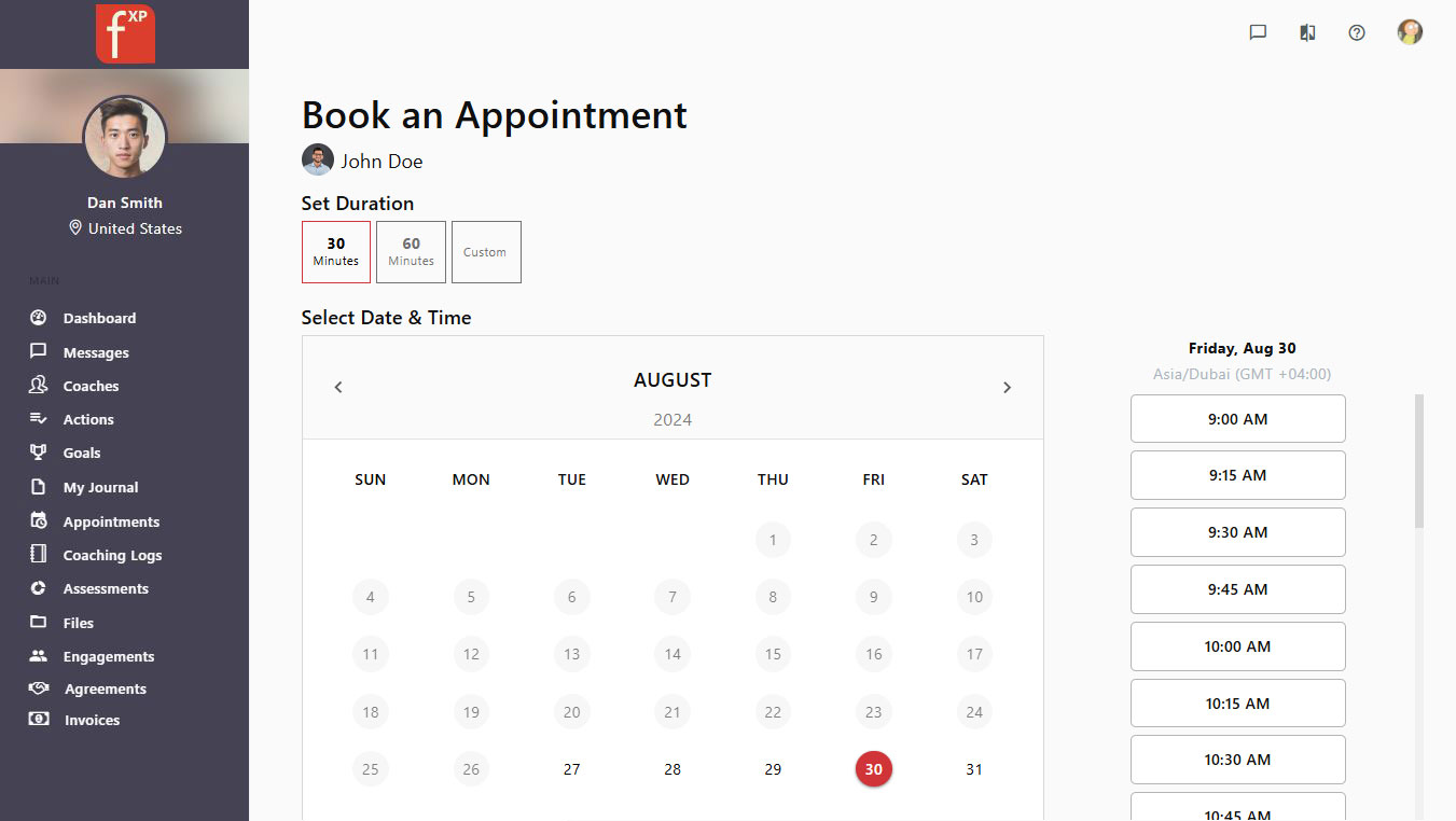 From here, the Coachee can now directly book appointments with the coach that they selected.