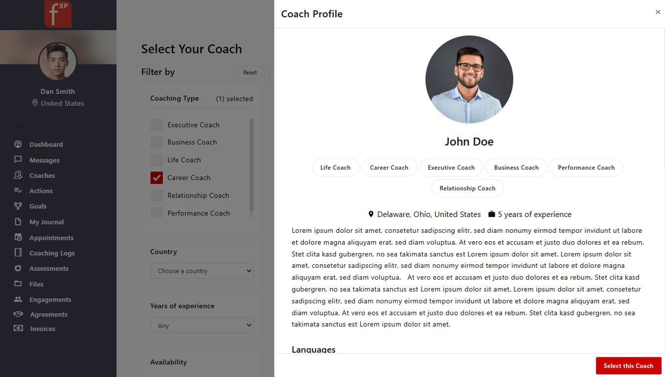 From this interface, users can select a coach by clicking the "Select this Coach" button located at the bottom-right of the Coach's Profile Summary.