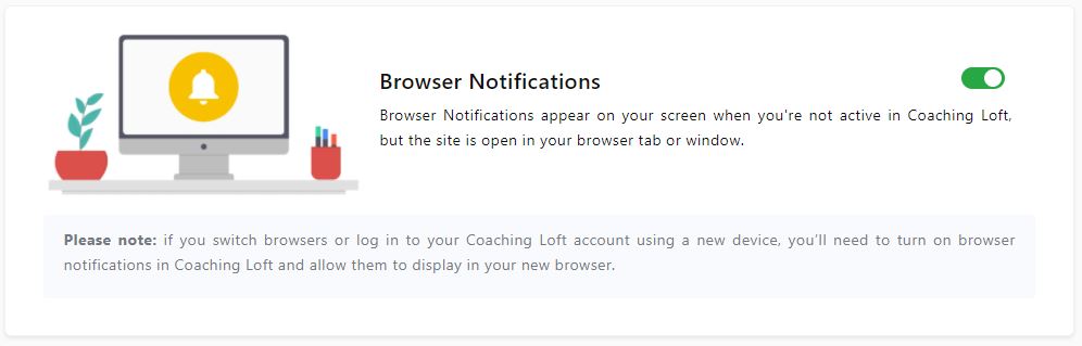 In addition to email notifications, Coaching Loft gives you the option to receive real-time browser notifications—helping you stay updated on coaching sessions, messages, and tasks without needing to check your email.