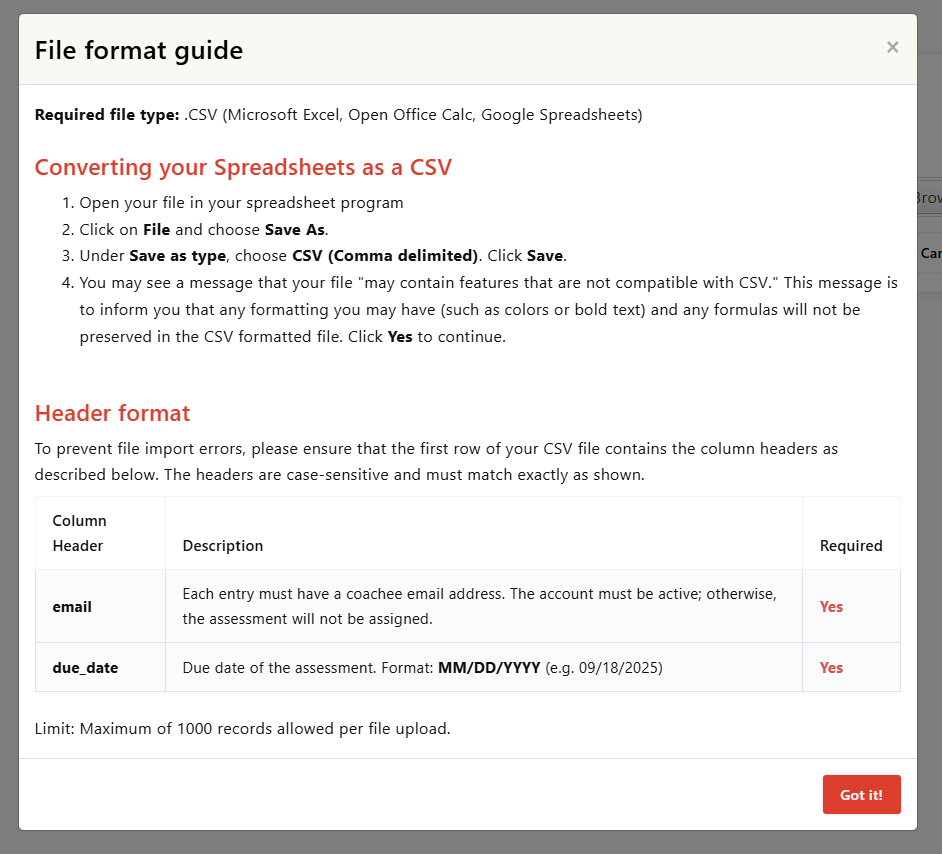 - Prepare your coachee list in a CSV file.