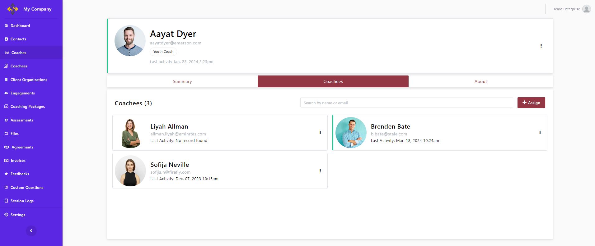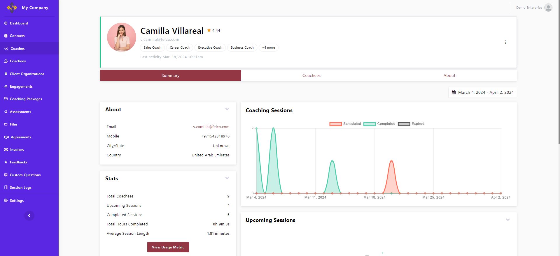 When you click on a coach’s name in your Coach List, you will be redirected to their Profile Summary page. This page provides a complete overview of the coach’s activities, performance, and account-related data within your enterprise.