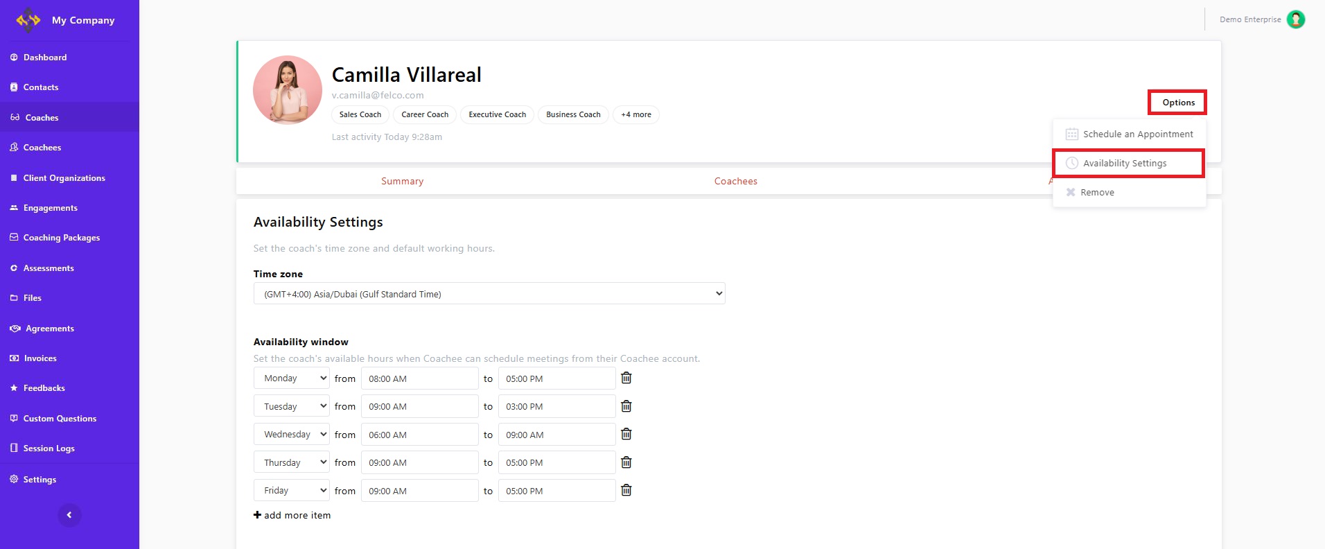 - You will be redirected to the Availability Settings page, where you can manage the coach’s timings, timezone, and other settings.