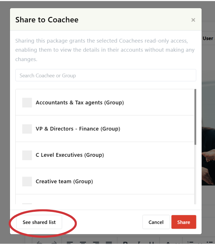 Both Coaches and Admins can track which coachees or groups a package has been shared with.