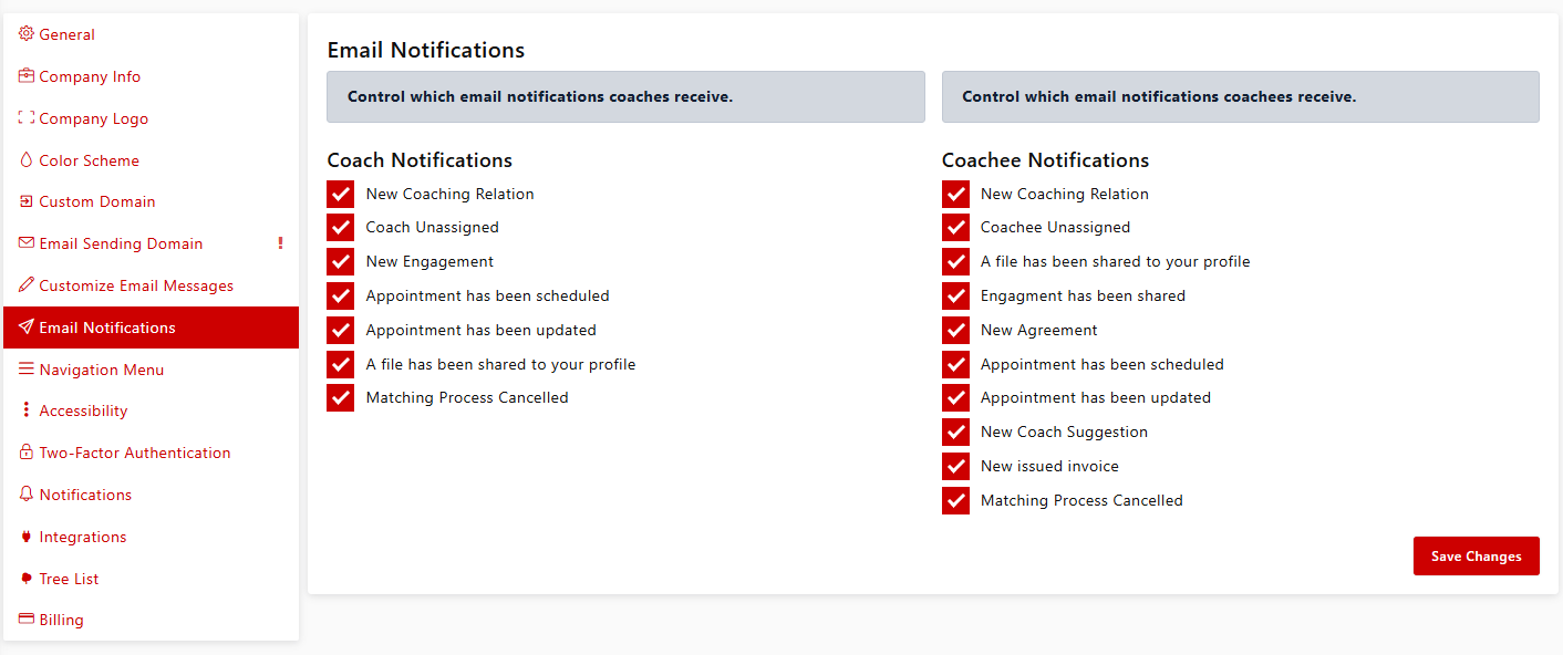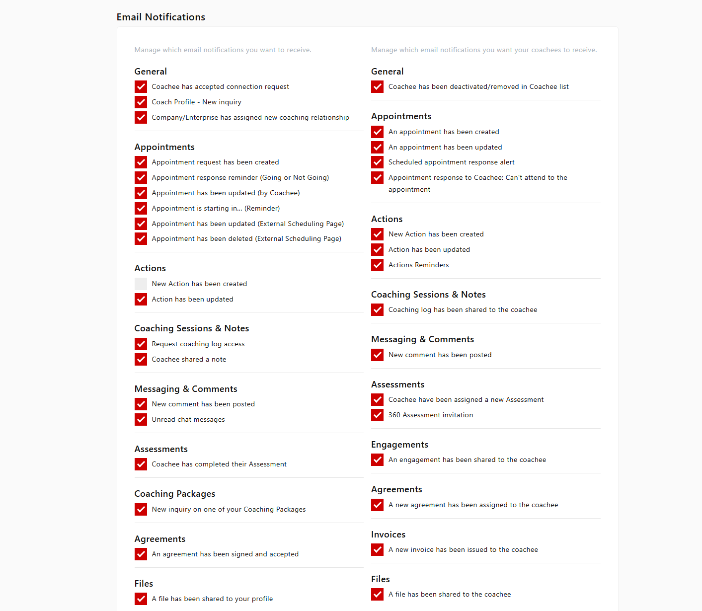 This feature is designed to give both Coaches and Enterprise Admins greater control over the platform’s automated communication. By customizing which email notifications are sent out, you can enhance relevance—ensuring coaches and coachees only receive what is relevent.