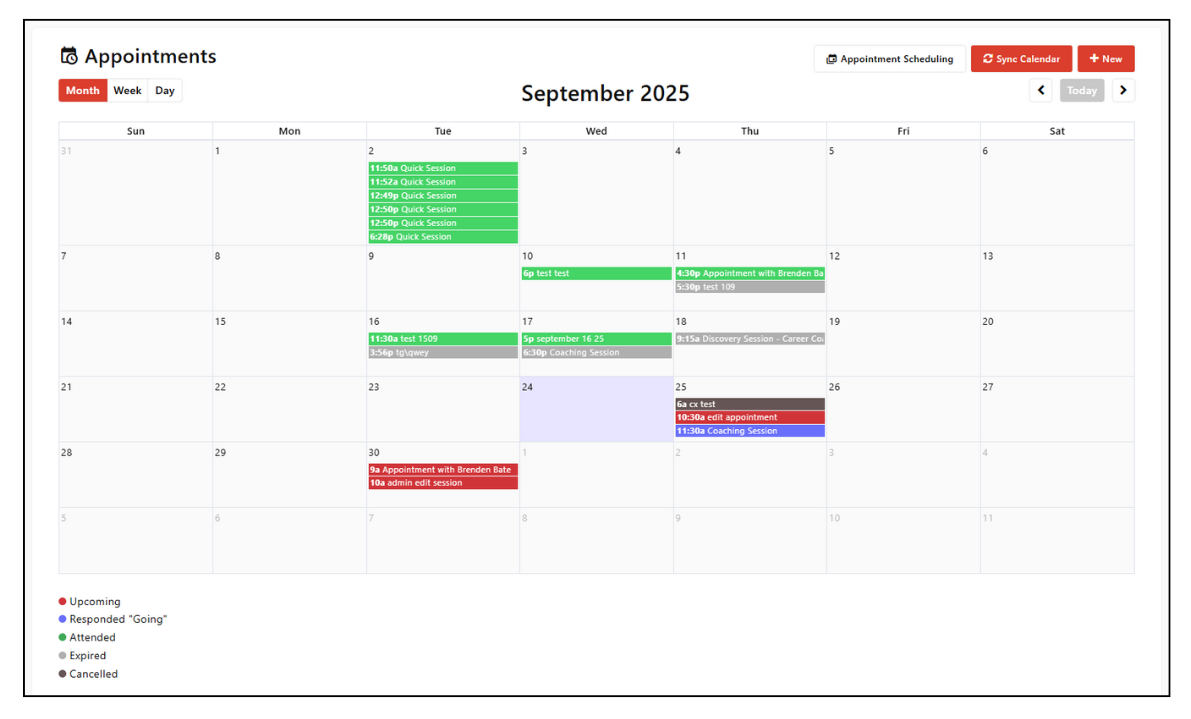 The Appointments Calendar provides a centralized view of all your coaching sessions—past, current, and upcoming. It is your go-to tool for scheduling, updating, and managing appointments on the platform.