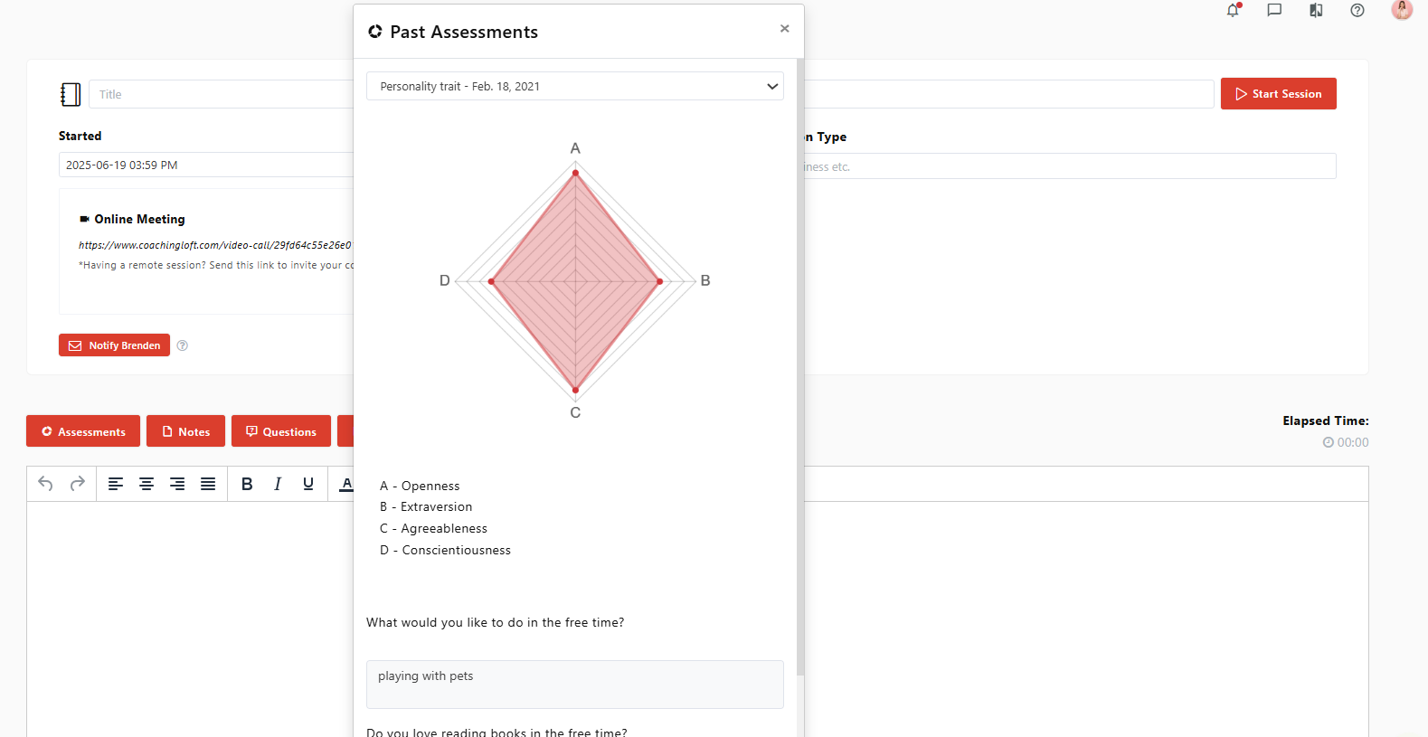 This section lists all the assessments assigned to the coachee. You can view assessments directly and reference them during live coaching sessions using the Coaching Notepad.