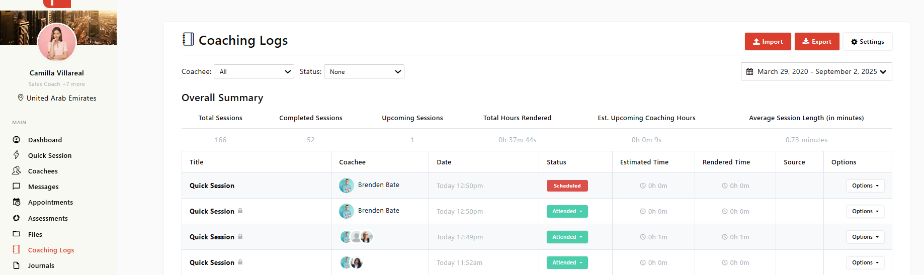 Coaches have full visibility into their session history through the Session Logs feature. This section provides a clear overview of past and upcoming sessions, along with detailed statistics and filtering options.