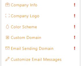 - In your Enterprise account under Settings, you will notice sub-menu items marked with "!". This indicates that these settings need to be configured properly and are important for setting up the white-label.